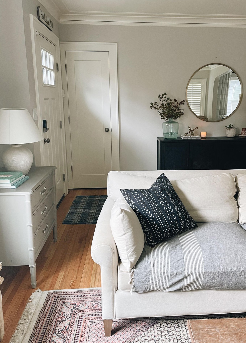 To help distinguish the two spaces, position the sofa with its back facing out of the living room.